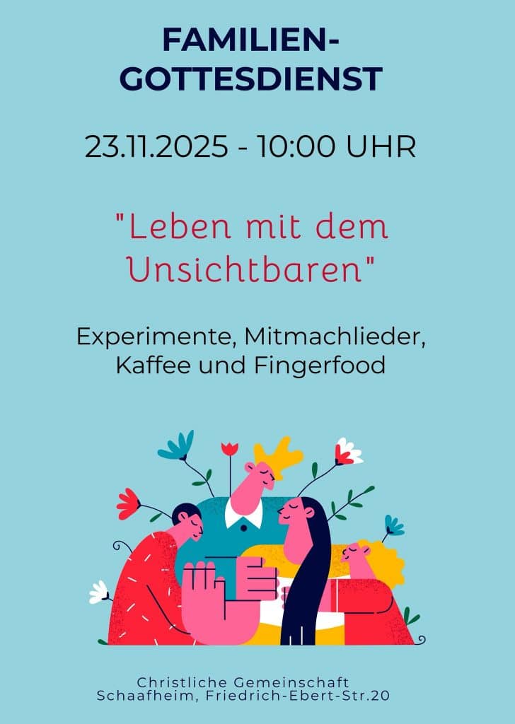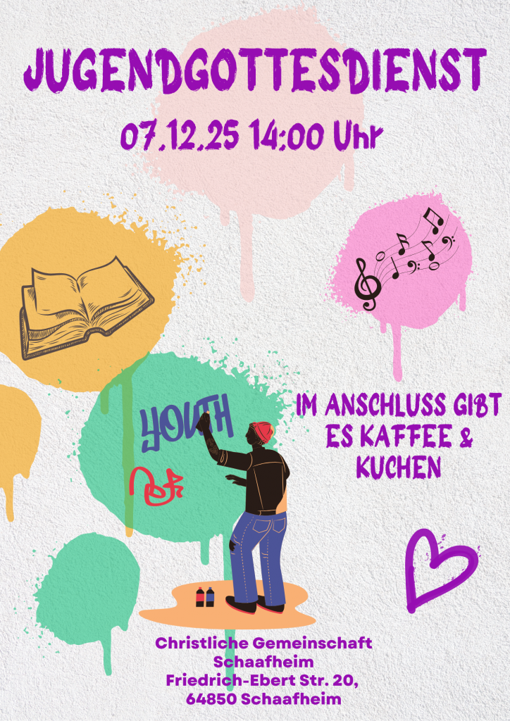 Du bist oder fühlst dich Jungerwachsen, dann komm mit in unsere Kleingruppe. Wir wollen gemeinsam im Glauben wachsen und das in verschiedener Art und Weise. (Jeden Dienstag 19:30 Uhr in Schaafheim; Kontakt: vikar@cg-schaafheim.de)